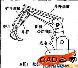 以WYL-3.5型挖掘機為例,該挖掘機所采用的反鏟工作裝置,主要由動臂、斗桿、鏟斗以及動臂油缸、斗桿油缸和鏟斗油缸組成。其基本結構如圖1所示。