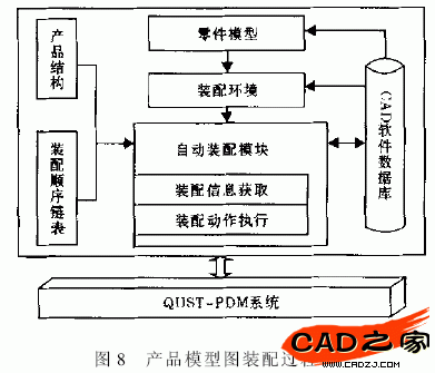 可將系統(tǒng)中的產(chǎn)品結(jié)構(gòu)樹(shù)按裝配的層次關(guān)系在CAD系統(tǒng)的裝配環(huán)境下進(jìn)行裝配。根據(jù)用戶(hù)需求在系統(tǒng)中從產(chǎn)品族結(jié)構(gòu)中按照零部件的配置約束進(jìn)行配置,從而形成新的產(chǎn)品結(jié)構(gòu)樹(shù),或?qū)σ延械漠a(chǎn)品結(jié)構(gòu)樹(shù)進(jìn)行修改。根據(jù)該產(chǎn)品結(jié)構(gòu)樹(shù),可以在CAD系統(tǒng)裝配出新的產(chǎn)品。對(duì)于可以預(yù)定義裝配關(guān)系的CAD系統(tǒng)(如 SolidWorks),并且裝配關(guān)系可以預(yù)先確定的情況下,則根據(jù)裝配層次關(guān)系及裝配參數(shù),通過(guò)系統(tǒng)的API操縱數(shù)據(jù)結(jié)構(gòu)自動(dòng)實(shí)現(xiàn)裝配過(guò)程。裝配過(guò)程可以后臺(tái)執(zhí)行,最后向用戶(hù)顯示裝配結(jié)果,也可以前臺(tái)執(zhí)行,給用戶(hù)直觀地顯示裝配過(guò)程。裝配過(guò)程如圖8所示。
