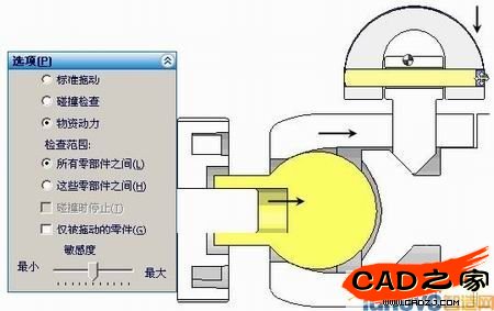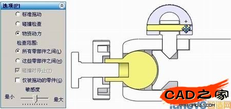 在移動(dòng)零部件的過(guò)程中,用戶可以使用物資動(dòng)力選項(xiàng),使另一個(gè)零件在被移動(dòng)零件力的作用下,按照自由度許可的方式運(yùn)動(dòng)。