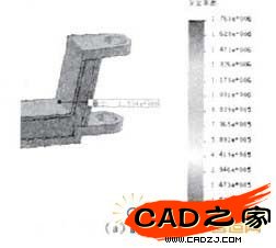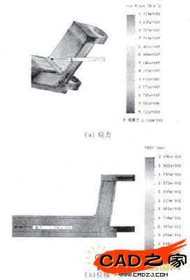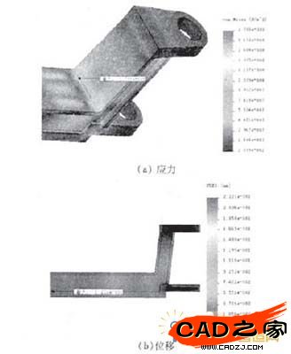 由應力圖解可很容易看出應力較大的區域,為結構改進提供明確的方向。最大應力值為178 MPa,而16 Mn的屈服應力為250 MPa。因此,該結構的最薄弱的環節也滿足強度要求。由位移圖解可以看出其最大位移為0.22 mm,滿足剛度要求。