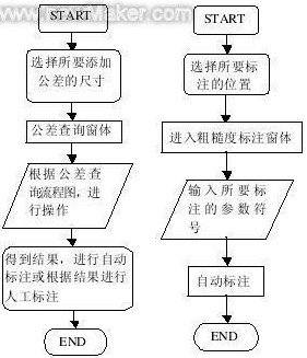 圖2 為兩個標(biāo)注功能實現(xiàn)的流程圖,清楚的描述了標(biāo)注系統(tǒng)的開發(fā)過程。流程圖可以引導(dǎo)整個開發(fā)過程,便于大型程序的模塊化設(shè)計,在軟件設(shè)計中是必不可少的。使用時可根據(jù)流程圖所示進(jìn)行操作。下面將結(jié)合實例進(jìn)行具體介紹。