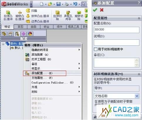 2)在“零件1配置”上單擊右鍵,“添加配置”,輸入新配置的名稱,這里我用銷軸的直徑X長度來命名。m.drbzy.com Cad之家(提示:配置名稱里不允許出現“/”和“@”字符。)如圖3