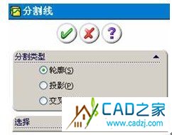 (9)如果選擇“交叉點”,會出現如圖9所示的“選擇”面板與“曲面分割選項”面板,在“分割實體/面/基準面” 中選擇分割工具(交叉實體、曲面、面、基準面、或曲面樣條曲線)。