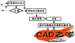 小車架參數(shù)——模塊化設(shè)計系統(tǒng)的基本開發(fā)研究思路是:首先研究產(chǎn)品功能模塊和結(jié)構(gòu)模塊的劃分方法,在此基礎(chǔ)上結(jié)合CAD技術(shù),研究功能模塊的參數(shù)化定義方法,實現(xiàn)功能模塊的變異,以支持這個產(chǎn)品的創(chuàng)新設(shè)計。為此,本文將小車架參數(shù)——模塊化設(shè)計系統(tǒng)的開發(fā)過程分成兩部分工作進行:即功能模塊建立和參數(shù)化基本模塊建立。具體的設(shè)計開發(fā)過程如圖1所示。