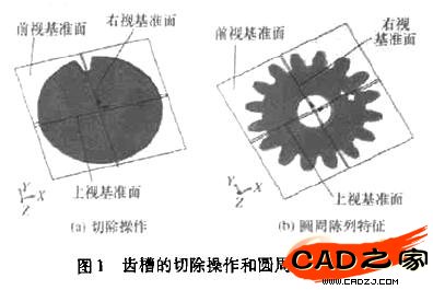 齒輪參數化建模包括4個模塊:系統界面設計模塊、齒形計算與生成模塊、輪毅生成模塊、三維實體模型生成模塊。系統界面設計模塊是建立交互的人機界面,接受用戶對圓柱齒輪具體參數(齒數、模數、壓力角、輪載半徑)的數據輸人,采取的方式是在SolidWorks下加掛利用COM方式生成的自定義動態連接庫后產生的界面接口對話框,在對話框中輸人齒輪具體參數。齒形計算與生成模塊是利用漸開線方程式,先計算出各個點的坐標值,在結合API函數生成一個齒形的輪廓。根據輸人的輪毅半徑,再通過API命令得到輪毅的二維平面圖形。接著通過切除命令,得到一個齒槽,再用圓周陣列陣列特征,得到所有齒形,完成齒輪的建模。圖1為齒槽的切除操作和圓周陣列特征。