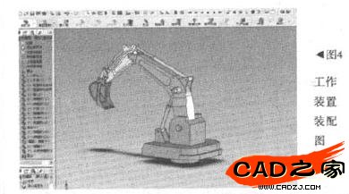 本裝配體在裝配時采用自下向上設(shè)計方法,即首先利用拉伸、陣列、切除等基本功能建立挖掘機工作裝置各個零部件圖,在裝配時先確定挖掘機底座作為固定件,其他的零件在固定件上按照裝配關(guān)系依次導人進行裝配,各個零件之間可加上所需的約束關(guān)系,如同軸、兩平面平行、兩平面重合等,這些約束使得到的裝配體更接近實際裝配體,整個裝配過程猶如在實際生產(chǎn)中進行實物組裝一樣,較為逼真。最終得到的工作裝置裝配圖如圖4所示。