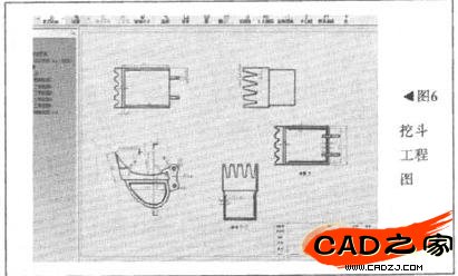 SolidWorks可利用自帶的工程圖轉(zhuǎn)換軟件方便地從三維模型自動轉(zhuǎn)換成二維工程圖。經(jīng)過轉(zhuǎn)換的圖形十分準確,并且產(chǎn)生各種視圖的功能比較齊全,如剖視圖、軸測圖、局部放大圖等都能自動生成,各種尺寸標注、形位公差、焊接符號等注釋均可自動產(chǎn)生,并且可以靈活調(diào)整尺寸的種類和位置。更重要的是,還能同MS Excel聯(lián)結(jié),白動生成各種符號,如明細欄、標題欄、明細表等。通過設(shè)置圖紙大小、填寫標題欄等即可生成符合機械制圖標準的二維工程圖。如圖6所示為挖斗工程圖。