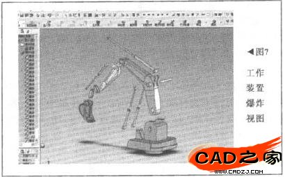 同時,在產(chǎn)品設(shè)計過程中,為了更明確地表達產(chǎn)品結(jié)構(gòu),往往需要提供一張所有零件按拆卸關(guān)系放置的裝配體圖,這種裝配體圖即爆炸視圖,通過此圖可形象地再現(xiàn)裝配體特征。在裝配體環(huán)境下,在插人下拉菜單中選擇〔爆炸視圖〕,出現(xiàn)爆炸視圖對話框。生成爆炸視圖有兩種方法:自動爆炸和手動爆炸。對工作裝置通過設(shè)定合適的爆炸視角、爆炸方向和爆炸距離而生成的爆炸視圖如圖7所示。