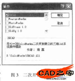 如果在 VC++ 調(diào)試環(huán)境下運(yùn)行 DLL 程序 ,系統(tǒng)會(huì)提示你輸入調(diào)用此 DLL 的可執(zhí)行文件名 ,選擇SolidWorks 可執(zhí)行程序的具體路徑后 SolidWorks 就會(huì)自動(dòng)運(yùn)行 ,使用 SolidWorks 的文件/ 打開菜單 ,在文件類型過濾器中選擇 Add~I(xiàn)ns ( 3 . dll)就可加載自己的 DLL 程序。DLL 注冊(cè)成為 SolidWorks 系統(tǒng)的插件后 ,還可使用工具/ 插件菜單打開插件對(duì)話框 ,選中需要加載的插件(如圖 3 所示) ,以后啟動(dòng) SolidWorks 就可自動(dòng)加載該 DLL 程序 ,無須再進(jìn)行加載操作 ,十分方便。