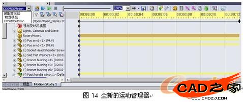 SolidWorks2008將所有的運動方法都經(jīng)集成到了運動管理器中(而非之前的用SolidWorks Animator 插件來實現(xiàn)),提供了三種層次的運動分析: 裝配體運動、物理模擬、 COSMOSMotion。此功能是基于選擇的算例類型逐級增加的,裝配體運動具有最基本的功能,物理模擬具有附加的功能,而COSMOSMotion則具有運動算例中可以使用所有的功能。