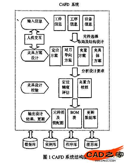 夾具設(shè)計(jì)過程不僅需要大量的有關(guān)零件設(shè)計(jì)、工藝和加工的數(shù)據(jù),同時(shí)還需要設(shè)計(jì)人員具有很豐富的領(lǐng)域知識(shí)和設(shè)計(jì)經(jīng)驗(yàn)。根據(jù)夾具設(shè)計(jì)要求和系統(tǒng)功能分析.將三維CAFD系統(tǒng)分為以下幾個(gè)功能部分:信息輸入功能部分、輔助方案設(shè)計(jì)功能部分、設(shè)計(jì)校驗(yàn)功能部分和結(jié)果輸出功能部分。輸入信息包括:工件信息、工序信息、設(shè)備信息三個(gè)部分;夾具方案設(shè)計(jì)需要設(shè)計(jì)定位方案、對刀導(dǎo)向方案、夾緊方案、夾具體方案;夾具設(shè)計(jì)校驗(yàn)主要是指定位精度評估和夾緊力的校核;最后一個(gè)過程是輸出設(shè)計(jì)結(jié)果,包括元件圖、裝配圖BOM表,并更新數(shù)據(jù)庫。系統(tǒng)結(jié)構(gòu)如圖1所示。