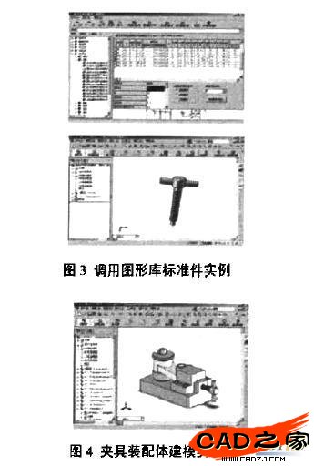 本文提出了一種在SolidWorks平臺基礎上的三維CAFD系統的結構體系。通過建立SolidWorks二次開發的夾具三維圖形庫,以及SolidWorks在夾具設計時在裝配體建模和分析中的運用方法,提出開發基于SolidWorks三維平臺的CAFD系統,用以有效提高夾具設計的效率和標準性。圖3和圖4分別為調用三維夾具圖形庫的標準件實例和在SolidWorks裝配環境下面生成的夾具裝配體的模型實例。