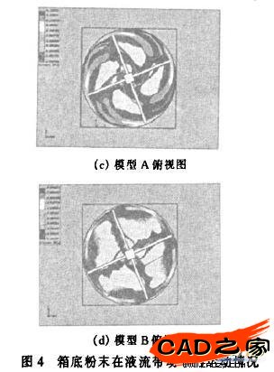 從圖4a中可看出,在模型A中,粉末在側壁方向的分散程度較均勻,這是由于沉淀的粉末被射流從主箱體中心向側壁方向推動,從而產生移動并盤旋向上運動。但在圖4c中可看到,液流在中間部位速度減慢,出現了橙色區域,這部分液流部分可能會產生沉淀現象,靠近中心位置的射流是不能到達上層的。由此可推斷,模型A中液流對箱底的沖刷是不完全的,部分粉末顆粒將會因液流速度變慢而最終沉淀,從而不能使沉積的粉末完全浮起,形成死角;從圖4b中可看出,在模型B中,粉末在側壁方向的分散程度雖然沒有模型A中的均勻,但并沒有產生橙色即流速減慢的現象,因此,由于液流速度減慢而形成粉末沉積死角的可能性將會比模型A少很多。為了解決粉末沉積死角間題,我們在平行射流組的上方設置了一個手動的旋轉撥桿,在射流啟動時適當地旋轉平行射流組,可使粉末全部懸浮起來。