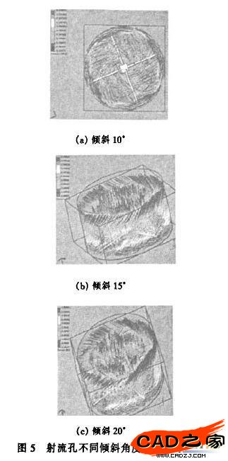 從圖5可看出,向下傾斜200時液流分散效果最好。但考慮實際加工情況,經過綜合對比分析,最終選定向下傾斜15°-20°作為最終實際加工參數。