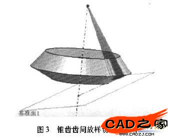 直齒圓錐齒輪造型的基本思路是先畫出錐體,然后創建背錐切平面并在該平面上畫出一個當量齒形,用此當量齒形向錐頂放樣切除,最后把放樣特征陣列,得到完整的錐齒輪。由圖1加上必要的約束尺寸經過計算可知A,B,C,D,E,F點的坐標,畫出ABCDEF多邊形以Y軸為旋轉軸旋轉一周可畫出錐齒輪的錐體。其中圖1中R為錐距,m為模數,δl為分錐角、δa為頂錐角、δf為根錐角、b為齒寬b=R/3,如果給定錐齒輪的大端模數。、配對錐齒輪的齒數z1.z2多邊形ABCDEF很容易繪制。由圖1可知BC直線繞Y軸旋轉得到錐面,這一圓錐稱為背錐;由于錐齒輪的漸開線為球面漸開線故無法展開。為了研究方便可以用圓錐齒輪的當量齒輪,它的模數和壓力角與錐齒輪的大端的模數和壓力角是一致的,但是這一理論只是為了研究錐齒輪的正確嚙合和重合度等間題。因為計算機無法完成上述操作,作者采用等效思想將背錐面的展開用背錐上建立切平面來代替。(如圖2所示)