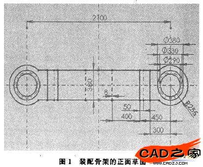 考慮到自頂向下設計的特點,并結合具體產品模型的特殊裝配結構,所有零件均采用自身的基準面和設計草圖中的要素(點、線、基準面)進行定位,而不用零件自身的特征要素定位,以避免個別零件發生變更或丟失造成整個裝配體結構解體.首先在裝配環境下繪制裝配骨架的正面草圖(見圖1)及側面草圖(見圖2).通過這兩個裝配骨架草圖,確定核心零件的外形尺寸,表示出零件之間的裝配位置、相互關聯特性等。在草圖繪制過程中要充分使用約束關系及尺寸之間的方程式,減少不必要的草圖尺寸,從而使布局草圖簡潔而又能清晰地表達出裝配零部件的約束關系、位置關系、尺寸關系及結構功能。