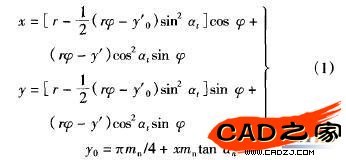 點線嚙合齒輪其小齒輪是漸開線變位的特殊短齒,大齒輪為具有部分漸開線和過渡曲線的凹齒廓。如圖1所示,xoy坐標系是固定在齒輪坯卜的靜坐標系,坐標系原點。在齒輪坯的中心;x1py1坐標系是固定在齒條刀具上的動坐標系,其原點P的起始位置取在齒輪輪齒對稱軸線與分度圓的交點P處。根據齒輪嚙合原理,當用齒條形刀具加工時,動坐標x1dy1的坐標軸py1沿被加工齒輪分度圓半徑:作純滾動,齒條刀具在齒輪壞上形成的包絡線就是齒輪的齒廓曲線。因此可推導出被切齒輪的齒廓曲線方程,其中齒輪齒廓漸開線部分方程式為: