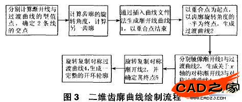 為形成精確的斷廓,采用插人足夠多的型值點,再用樣條曲線擬合的方法形成齒廓曲線,為保證"拉伸切除"的順利實現(xiàn),必須形成完全封閉的齒廓曲線,因此要保證侮段弧線之間的連線點完全重合。繪制流程如圖3所示。
