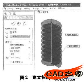 在前視基準(zhǔn)面中分別建立草圖1和草圖2,如圖1所示。草圖1中的直線一個端點在坐標(biāo)原點,設(shè)里水平約束,其長度為彈簧中徑的二分之一,可以用尺寸標(biāo)注約束其長度。草圖2中的直線的一個端點在坐標(biāo)原點,設(shè)置豎直約束,其長度為彈簧自由狀態(tài)下有效長度值,但不要標(biāo)注尺寸。建立掃描曲面特征,以草圖1為輪廓,草圖2為路徑,在選項的方向扭轉(zhuǎn)類型中選擇沿路徑扭轉(zhuǎn).度數(shù)為彈簧有效圈數(shù)乘以360°.如圖2所示。