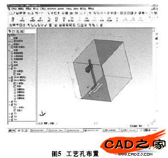 從離進油口最近的電磁換向閥開始,利用異型孔向導將該閥對應的連接板安裝尺寸生成在集成塊頂面上。圖4中電磁閥連接板的所有安裝尺寸均以左上角的固定安裝螺紋孔為基準,改變閥安裝位置時只需更改基準螺紋孔的連接尺寸,其他尺寸跟隨該尺寸自動刷新。在側面生成工藝孔,檢查該閥的油孔與進油道的連通情況(圖5) ,如果不滿足要求,則適當改變進油口位置、該閥位置或對應油孔的長度。