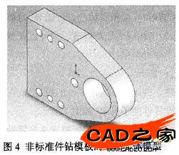使用的機床;夾具上定位元件、夾緊裝置、對刀裝置、導向裝置、分度裝置等的布置;夾具體使用的材料;加工過程中的排屑方法等等。因此非標準零件的結構、尺寸很難統一,不能像標準零件那樣建立參數化的模型庫,而是對非標準件逐個建立三維模型,并存人個性化的模型庫。本文利用SolidWorks軟件建立了非標準件三維模型,構建了非標準件的個性化模型庫。圖4所示為非標準零件鉆模板的三維實體模型。