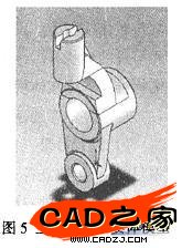 三維虛擬裝配時,先打開總裝圖圖形窗口并對被加工工件進行三維造型(如圖5),再調用并虛擬裝配夾具的定位、夾緊、分度、對刀、導向等元件或裝置。標準零件的調用方法是:先雙擊【機床夾具通用零件】根目錄,再雙擊所需的標準零件文件夾,雙擊欲選的標準零件模型的圖形文件使之可視化,然后將其復制后粘貼在總裝圖窗口。非標準零件的調用方法與標準件相同,只是數據庫和數據存取路徑(文件夾)不同。裝配時,先要確定基準,即選有配合或有位置要求的面作為基準;再按配合或要求的位置逐個確定各夾具零件的安裝位置,組裝成蘭維模型。