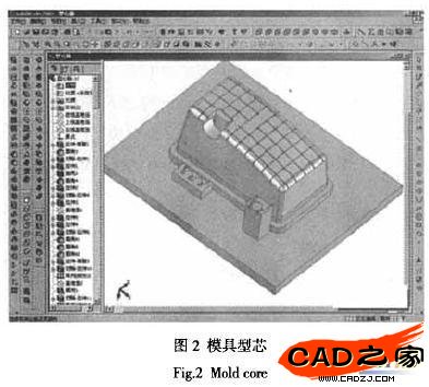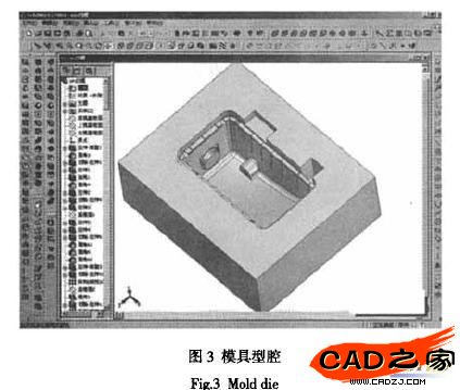 型芯/型腔創建模塊用于分模過程中創建型芯和型腔的一系列工具。它主要是使用生成的分模面對毛坯進行分離,其他的鑲塊則可以使用SolidWorks自身的型腔功能進行創建。它的分模處理方法有兩種:標準分模法和進階分模法。在設計過程中,兩種方法都使用過,各有千秋。圖2和圖3分別是模具的型芯和型腔。型芯和型腔完成后,便可對復雜的型芯和型腔進行數控編程,將程序輸送到加工中心便可進行數控加工。