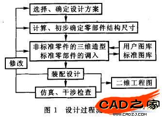 應用SolidWorks進行設計,需要選定設計方案,進行零件和裝配體的建模,經過檢驗之后要輸出適合工廠使用的二維圖紙.其設計的一般過程和方法,如圖1所示.