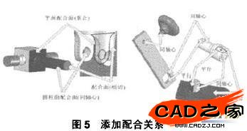 添加配合關系。采用同樣的方法,逐步添加配合關系。單擊裝配體工具欄上的【配合】,配合管理器出現(xiàn),在圖形區(qū)域中選擇如圖5所示的配合關系,零部件移動到位,預覽配合,即可執(zhí)行操作。