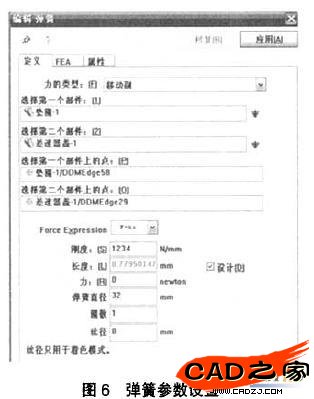由于COSMOSMotion軟件中沒有碟形彈簧模型,所以需要將碟形彈簧按實際工作參數(shù)轉(zhuǎn)化為圓柱螺旋彈簧,仿真效果完全相同。根據(jù)碟形彈簧剛度試驗所得的數(shù)據(jù).轉(zhuǎn)化為圓柱螺旋彈簧后的參數(shù)設置如圖6所示。