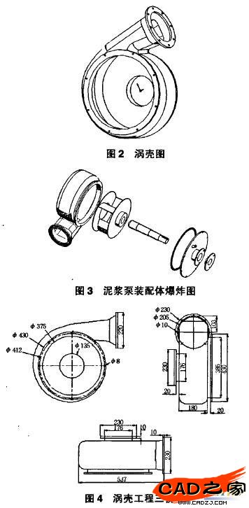 用傳統的方法繪制泥漿泵葉輪圖比較繁瑣,不僅要計算大量的數據,而且要繪制大量的圖紙,尤其工作輪廓面是空間不可展曲面,數學模型極其復雜,很難用常規的機械制圖方法繪制。在這種情況下,借助于計算機進行輔助設計就比較方便。在三維造型軟件中,SohdWorks的功能比較強大,操作比較簡潔。本次設計選擇 solidwokrs進行二次開發,提高了產品的設計效率和所建三維模型的精度,為以后的零件加工和分析提供了重要的原始數據和數控編程依據。渦殼的三維結構如圖2所示。在裝配體中的位置可通過爆炸圖顯示,如圖3所示(按爆破方向為:密封蓋-前蓋板-密封圈-傳動軸-葉輪-渦殼),為方便企業中使用,也可以生成工程三視圖,如圖4所示。