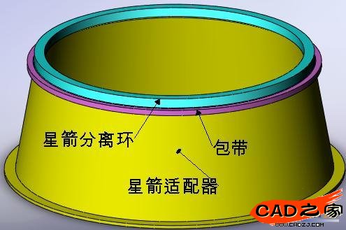 衛星的星箭分離環下法蘭為一斜面,通過與包帶斜面的配合將其壓緊在星箭適配器上法蘭上(見圖1、2)。圖2中星箭分離環上端面與衛星相連,星箭適配器下端面與火箭相連,從而形成發射時的狀態。