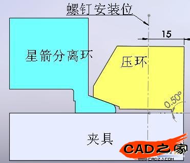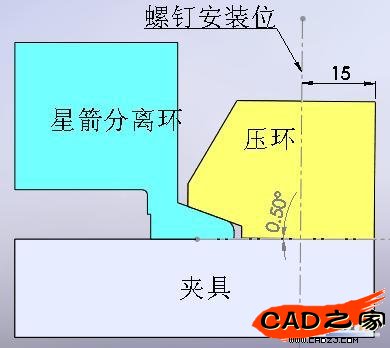 本設計取衛星的星箭分離環斜面角度為20?,壓環為了與其配合,斜面的角度有20?和小于20?兩種選擇。前者必須使壓環的高度比計算高度小,后者壓環的高度可與計算高度相等。兩種方法在預警原理上是相同的,安裝后,壓環都具有一定程度的上翹(一般相對于夾具上平面的夾角為0.5°~1°),其與夾具的接觸為線接觸,上翹后形成的空間正好形成了橋梁效應,將螺釘的下壓力傳遞給星箭分離環斜面以及壓環與夾具的接觸部位。本文選用的斜面角度為19.5?,壓環高度與計算相當。