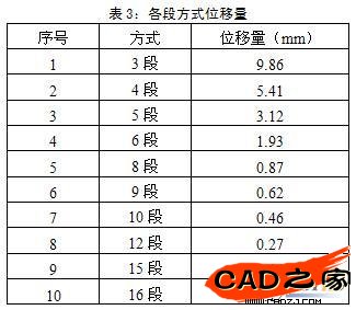 靜力分析力圖模擬在徑向回復力的作用下,各段壓環的位移情況。影響壓環回復力大小的因素很多,如切削方式、截斷情況、熱處理條件等。每段回復力的具體數值是無法通過計算求出的,因此只能通過假設進行定性分析,為每段壓環的自由端面施加1000N的徑向力,約束方式與模態分析相同,計算自由端在相同受力情況下的最大位移量,并作趨勢分析。經求解3段方式靜位移量見圖13,各段方式靜位移量見表3。