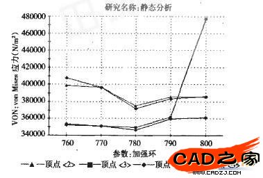 由圖3可知4個頂點都在加強環中心線直徑為780mm的情況下vonMises應力最小。頂點<2>和頂點<4>在加強環中心線直徑為760mm的情況下vonMises應力最大,而頂點“>和頂點<5>在其為800mm的情況下vonMises應力最大。且頂點<4>的應力是迅速增大。
