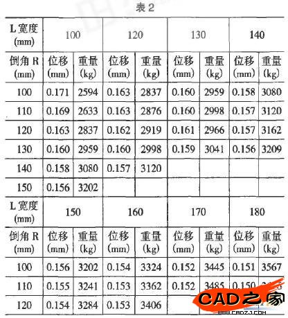 從國7 中還可以看出:其寬度L 與倒角半徑R 是影響橫梁受力特性的主要因素。跟據橫梁結構設計的需要,其中L≤180mm, R ≤(400-L)/2 mm。 分別通過在-維空間內分別使用橫梁相應的L 及R 尺寸,得出橫梁中心位置的Y 向最大輸出及橫梁質量關系如表2所示。