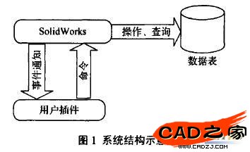 SolidWorks是基于Windows的全參數(shù)化特征造型軟件,為用戶提供了Windows對象鏈接嵌入(OLE Automation)和部件對象模式(COM)的應(yīng)用程序接口,以及豐富的API接口函數(shù)和完整的消息事件機制,可以方便的使用C++或VB對軟件進行二次開發(fā),生成可執(zhí)行文件或插件。在這里選用VB配合為SolidWorks開發(fā)插件的方式來實現(xiàn)軟件功能。系統(tǒng)結(jié)構(gòu)示意圖如圖1所示。