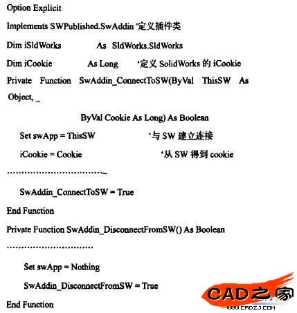 SwAddin對象允許我們建立SolidWorks插件。在VB6建好的工程文件中點選"工程"菜單,"引用"菜單項,分別選中"SolidWorks 2006 exposed type type libraries for add-in use"、"SolidWorks 2006 Type Library"、"SolidWorks 2006 Constant type Library"、"Microsoft DAO 3.6 Object Library";在聲明處插入如下語句: