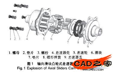 孫傳祝等在總結了各類差速器的優缺點后,提出了一種新型差速器--軸向滑塊凸輪式差速器。它是防滑差速器的一種,結構簡單,體積更小.成本低廉,已實際應用于發動機排量在400 mL以下(功率≤20 kw)的越野車,左右兩輪差速效果比較理想,兩半軸的轉矩也比較大。本文針對用于發動機排量為500 mL,即車輛功率增大后的該差速器做了進一步分析研究。