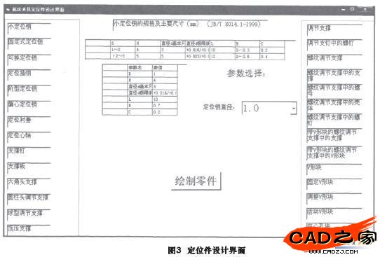 機床夾具零件的通用性比較好,就像標準件一樣,因此我們可以利用Access建立機床夾具定位件的各種元件的尺寸數據庫(如圖2所示),然后利用VB編程設計出來一個設計定位件庫的界面(如圖3所示),在這個界面中利用制定好的數據庫中的尺寸來驅動建模,從而在SolidWorks界面中生成需要的定位件。