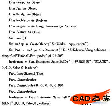 (2)參數化模型針對要建立的實體,先分析其結構,使所建立的特征盡可能簡單,參數尺寸盡可能少。用SolidWorks建立模型,并利用宏錄制其建模過程,建立一宏文件(即內部編程)。然后復制并粘貼宏代碼到VB中,對代碼做一定的修改,用變量代替宏代碼中的關鍵數據。這些變量的數據來自于Microsoft Access數據庫中的某一種零件的數據表,通過程序驅動變量,實現模型的建立和更新。根據設計者給出的關鍵參數在程序內部自動執行,無需人工干預。