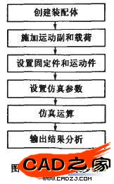 SolidWorks是基于Windows環境的特征化三維實體造型軟件,其中與之實現無縫集成的COSMOSMotion插件更是一個全功能的運動仿真軟件,它可以對復雜機構進行完整的運動學和動力學仿真,得到系統中各個零部件的運動情況,包括能量、動量、位移、速度、加速度、作用力與反作用力等結果,并能以動畫、圖表、曲線等形式輸出;還可以將零部件在復雜運動情況下的載荷情況直接輸出到主流有限元分析軟件中,從而進行正確的結構強度分析。COSMOSMorion仿真的一般步驟如圖5所示。