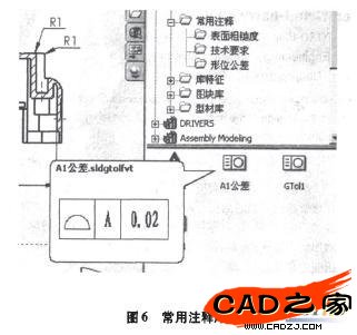 工程圖是一個非常繁瑣、工作量非常大的工作,SolidWorks雖然提供了強大的工程圖視圖功能,可以很方便地創(chuàng)建我們需要的視圖,自動的尺寸標注,但有部分的注釋經(jīng)常被使用,譬如表面粗糙度、形位公差和常用技術(shù)要求等。我們可以把常用的注釋分別保存在注釋庫里(圖6),需要的時候直接由注釋庫拖拽到指定的位置即可。