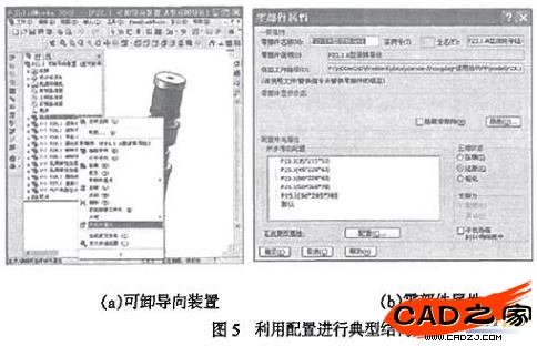 (4)在完成的裝配體中,針對每一組成零件,右鍵單擊構成零件名稱后點取"零部件屬性"。如圖5所示,更改為需要的配置,對每-構成零件重復該步驟,直到按要求更改好所有零件配置。