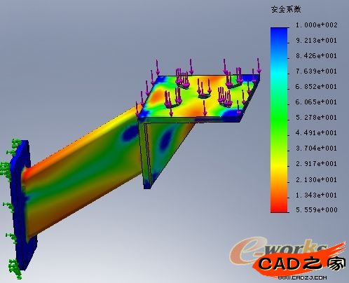 由上圖數據可知,在已知載荷下,零件所受應力最大區域為小于零件的屈服力 ,所以我們初步認為支架的力學性能滿足設計要求。為了進一步了解零件的使用性能,又分析了零件在工作條件下的安全系數。結果顯示零件的最少安全系數為5.6,高于往常的經驗值3.0,通過最終分析,支架符合設計要求。