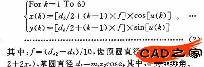 齒廓的生成主要有兩種方法,一種是用直線段逼近的方法,另一種是先確定齒廓上的部分點(diǎn),用曲線擬合的方法。直線段逼近法計(jì)算量比較大,曲線擬合算法簡(jiǎn)單同時(shí)在精度上也不比直線段逼近法差,所以選擇曲線擬合的方法生成漸開線齒廓。利用直角坐標(biāo)系下的漸開線方程生成不同角度杯對(duì)應(yīng)的點(diǎn),循環(huán)確定60個(gè)點(diǎn):