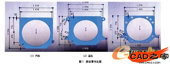 (4)基礎件庫。企業在開發新產品時,往往在原來的產品上加以改進,其結構變化并不大,而且產品中相似的零件非常多,如電機機座零件擋板、隔板和端板非常相似,如圖l所示,端板和隔板都可以從擋板模型上修改得到,這樣就可以避免了重復設計,因此將類似擋板功能的零件建立一個基礎件庫,需受時只須直接調用,節約設計時間。