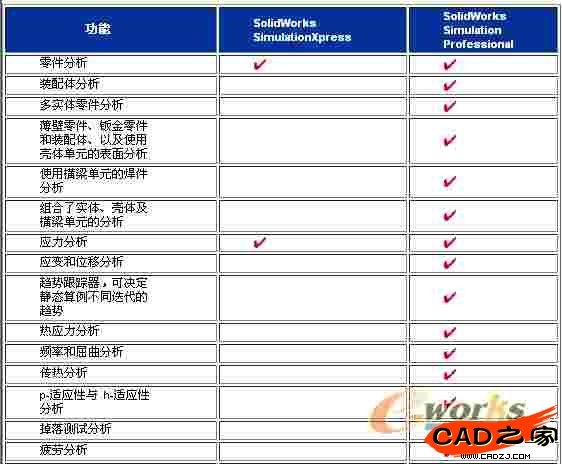 針對非線性分析, SolidWorks Simulation有多種軟件包可供使用。SolidWorks Simulation Professional 是 SolidWorks SimulationXpress 的正常升級版本。下表對 SimulationXpress 和 SolidWorks Simulation Professional 的功能進行比較: