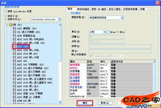 ( 4 ) 指定各個(gè)零件不同的材質(zhì)。單擊“ 零件 ”前的“+”號(hào),展開所有零件,如圖13所示,然后“右鍵”單擊“保持架-1”,如圖14所示,在快捷菜單中選擇“應(yīng)用/編 輯材料”命令。在“材料”對(duì)話框中選擇“A I S I 1020”, 該材料的機(jī)械屬性出現(xiàn)在對(duì)話框右側(cè)的“屬性”標(biāo)簽中。如 圖15所示,然后單擊“確定”按鈕完成材料的指定。