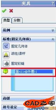 下方的小三角,并單擊下級(jí)菜 單中的“固定幾何體”按鈕,此時(shí)在左側(cè)的特征樹中出現(xiàn) 對(duì)話框。在圖形區(qū)域單擊外圈的外圓柱(見(jiàn)圖16),“面<1>@外圈-1”出現(xiàn)在“夾具的面、邊線、頂點(diǎn)”框